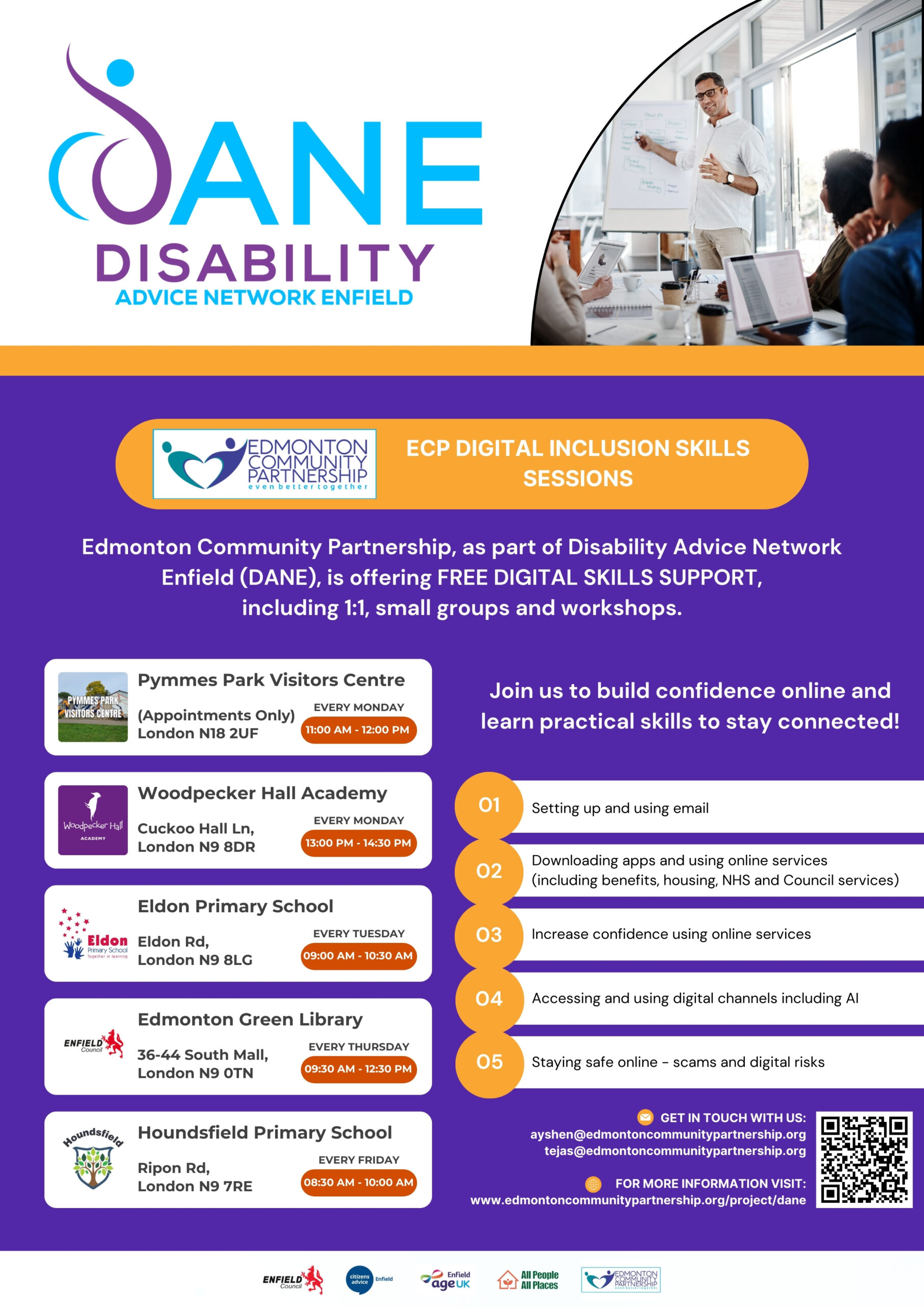 Edmonton Community Partnership is proud to play a leading role in delivering digital inclusion and community-based support as part of the Disability Advice Network Enfield (DANE) programme.